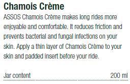 ASSOS' legendary chamois creme is a pre-ride necessity that reduces friction-caused irritation, rehydrates and replenishes the skin, and minimizes the risk of saddle sores.