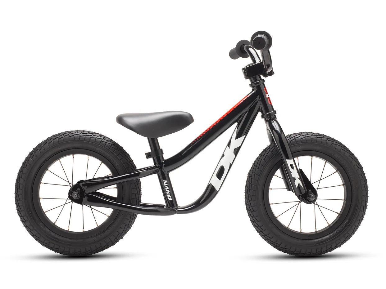 The DK Nano Balance bike is a great way to introduce your child to the world of bicycle riding without the use of training wheels or a tricycle. The DK Nano has been designed from the ground up to meet the needs of children and parents alike. It includes a low-profile hi-ten steel frame with an integrated foot platform, alloy riser handlebar, 1” threadless headset and fork, 12” alloy wheels with inflatable tires, and an adjustable padded seat. With a balance bike (also known as a “push bike”) your child will learn the fundamentals of balance and bicycle control first, making the transition to pedal bike much easier.