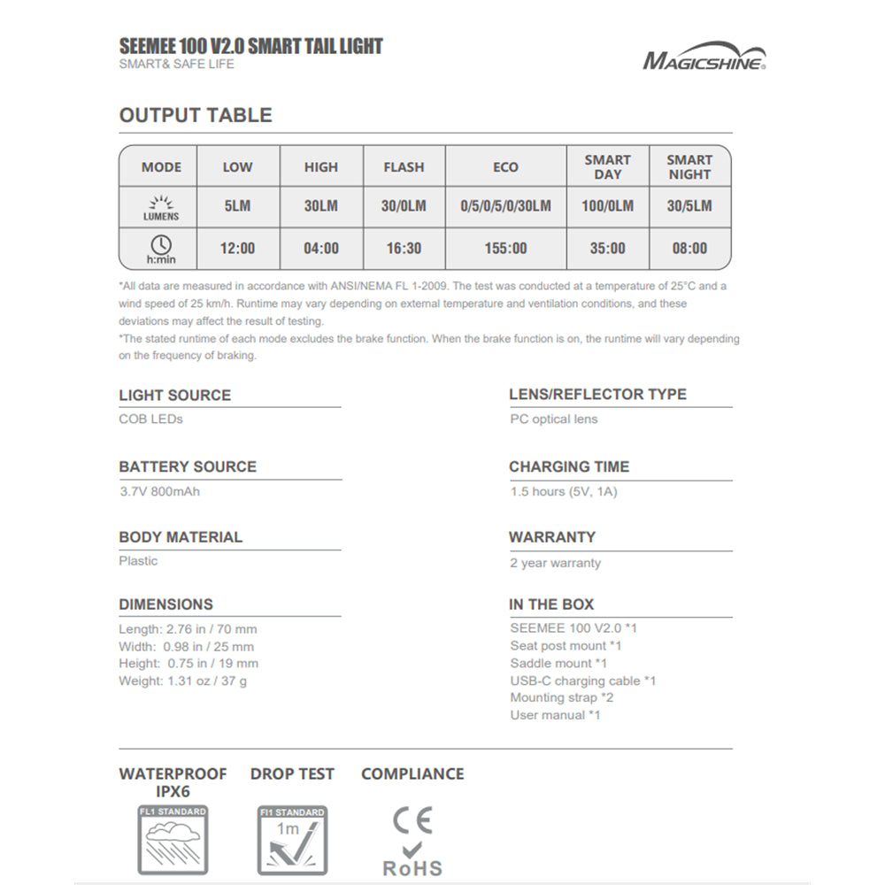 Magicshine Rear Light - SeeMee 100 - Brake & Ambient Light Sensor - USB C - IPX6 V2